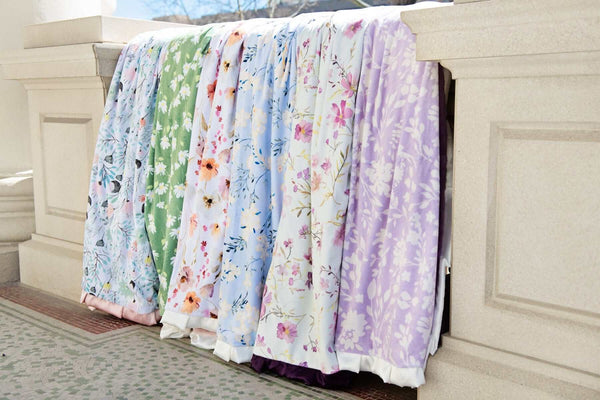 - Details: The Blush Wildflower Blanket showcases a beautiful floral print on a crisp white background, bringing a soft and airy charm to any space. Its plush fabric offers cozy comfort while the delicate design adds a touch of elegance. This blanket is backed in a blush plush minky with a cream satin ruffle.