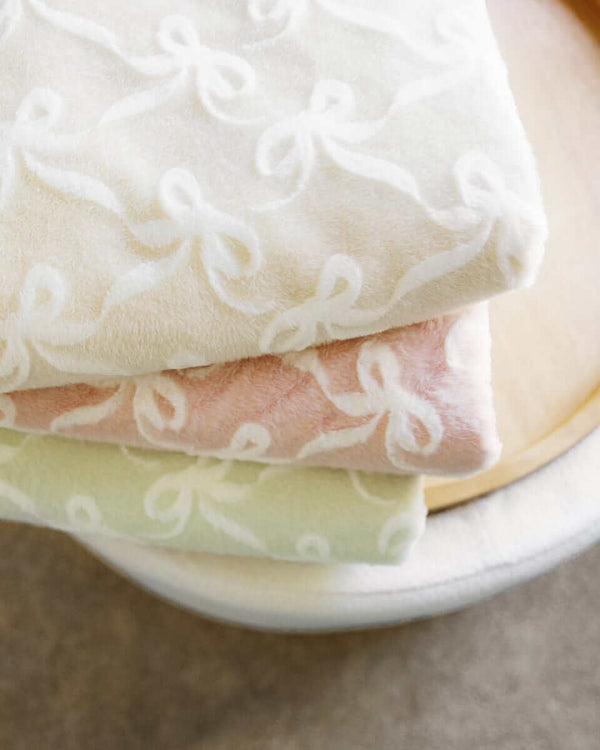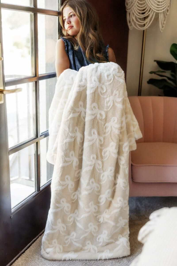 - Details: Bring neutral elegance to your space with our Plush Bows Sand blanket. This cozy favorite features a warm tan color and a charming embossed bow pattern throughout. Made with ultra-soft, plush fabric, it offers a gentle, soothing texture that’s perfect for relaxing, layering, or gifting.